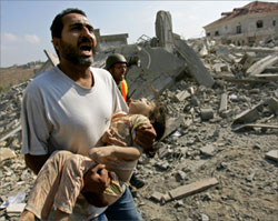 There were dozens of people drawn from two extended families sleeping on the ground floor of an unfinished house when an Israeli jet dropped two bombs on them, destroying most of the building and crushing at least 60 victims under rubble and dirt. Only eight people managed to survive the massive double blast and haul themselves from beneath the debris.